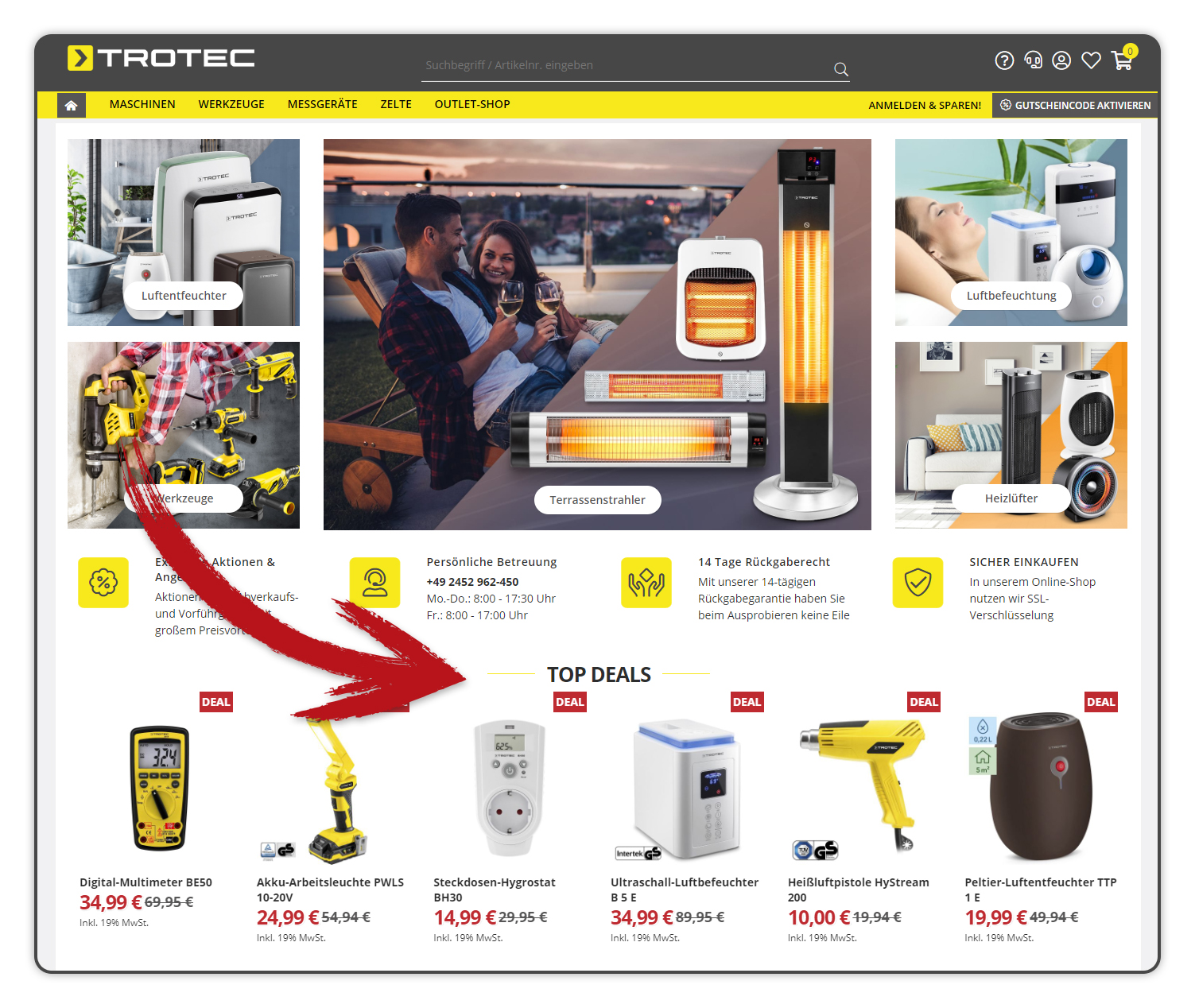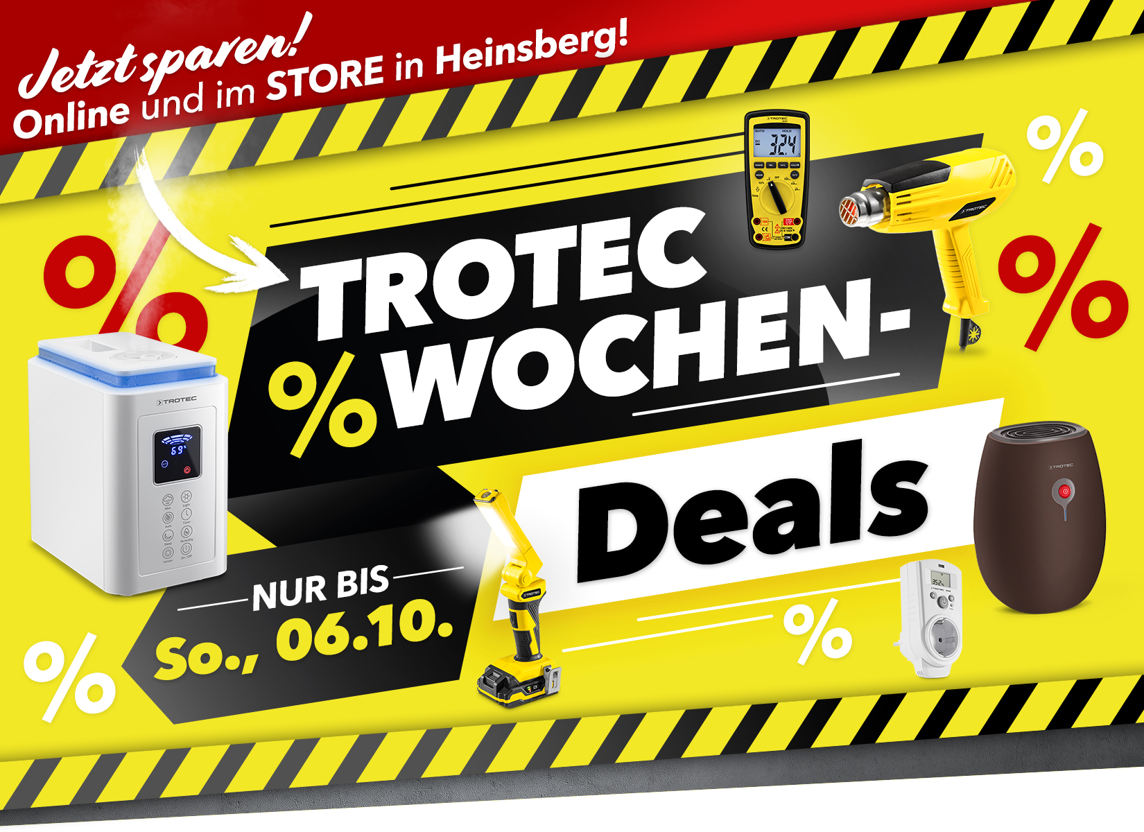 SO FINDEN SIE IHRE DEALS IM ONLINE-SHOP:Auf unserer Startseite im Online-Shop de.trotec.com/shop werden Ihnen alle „TOP DEALS“ angezeigt. Navigieren Sie einfach mit den Pfeilen nach „rechts“ und „links“ und Sie finden alle aktuellen Deals. |