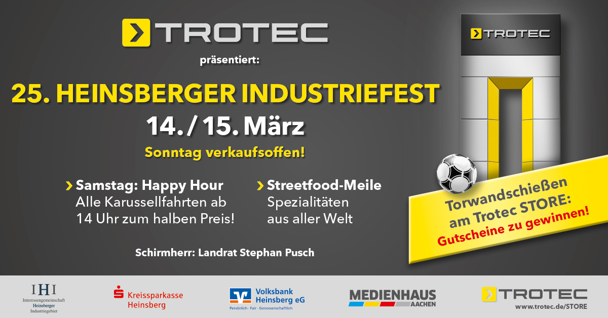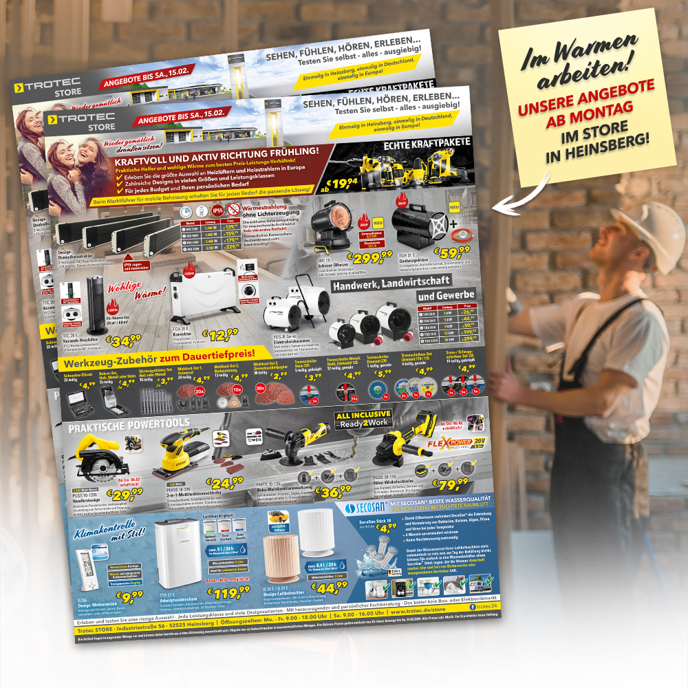 *Die Artikel liegen in begrenzter Menge vor und können daher bereits am ersten Aktionstag ausverkauft sein. Abgabe nur an Endverbraucher in haushaltsüblichen Mengen. Die Aktions-Preise sind exklusiv nur bis Sa., 15.02. bei Trotec vor Ort in Heinsberg gültig. Alle Preise inkl. MwSt. Für Schreibfehler keine Haftung.