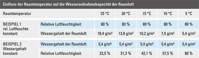Die Wasseraufnahmekapazität der Luft ist abhängig von der vorherrschenden Lufttemperatur. Je kälter die Luft, desto weniger Wasser kann sie aufnehmen. Dies veranschaulicht die folgende Tabelle an fünf Temperaturwerten.