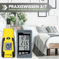 Dies geschieht am einfachsten mithilfe eines Hygrometers, etwa des kostengünstigen Raum-Thermohygrometers BZ05 oder BC06 von Trotec. Stellen Sie bei Ihren Messungen fest, dass die Werte bei Ihnen zu Hause oder im Büro stetig unter oder über den eingangs genannten Werten liegen, sollten Sie Ursachenforschung betreiben und Abhilfe schaffen. Denn nur mit einer normalen Luftfeuchtigkeit im Raum beugen Sie gesundheitlichen Problemen vor.
