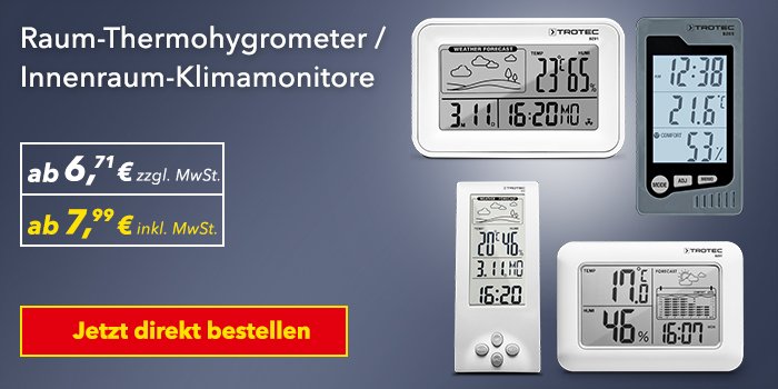 Raum-Thermohygrometer und Innenraum-Klimamonitore sind bereits ab 7,99 im Trotec-Shop erhältlich. Heute bestellt und schon morgen unterwegs zu Ihnen.