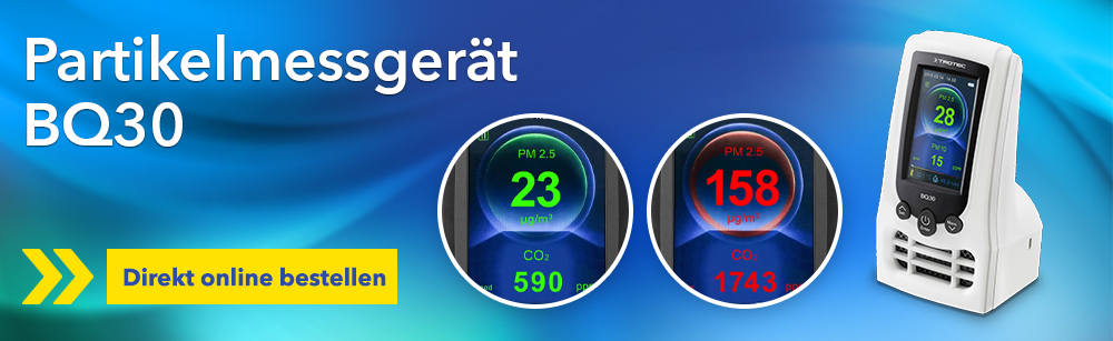 CO2-Monitoring nutzen neun Prozent, 65 Prozent verfügen über kein Messinstrument für Kohlendioxid. Das ist insofern verwunderlich, da sich die Luftqualität mit einem Luftqualitäts-Monitor zuverlässig und präzise überwachen lässt – bei vergleichsweise geringen Investitionskosten. Das praktische Partikelmessgerät BQ30 behält die Werte für Feinstaub, CO2, Lufttemperatur und Luftfeuchtigkeit stets im Blick, um bei Bedarf durch die Zufuhr von Frischluft oder durch den effektiven Einsatz von Luftreinigern, Luftbefeuchtern oder Luftentfeuchtern das Raumklima zu verbessern.