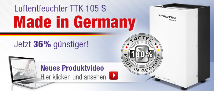 Exklusiv nur bei Trotec erhältlich – der komplett in Deutschland gefertigte Luftentfeuchter TTK 105 S vereint die besten Eigenschaften eines modernen Luftentfeuchters in einem widerstandsfähigen und stapelbaren Aluminiumgehäuse mit fortschrittlicher Funktionsausstattung. Machen Sie sich selbst ein Bild – mit unserem neuen Produktvideo!