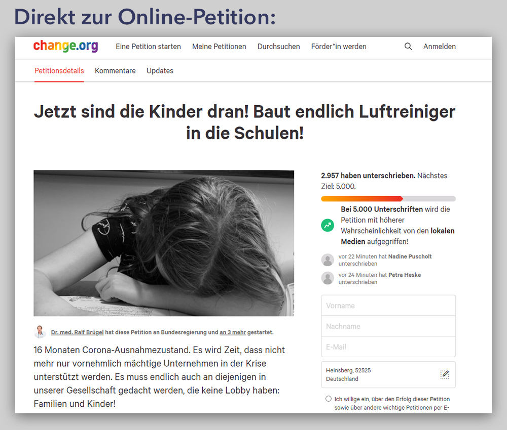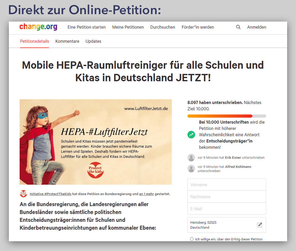 Petitionsseite: https://www.change.org/p/bundesregierung-mobile-hepa-raumluftreiniger-f%C3%BCr-alle-schulen-und-kitas-in-deutschland-jetzt-531330ad-8bea-4219-819f-437c543c243c