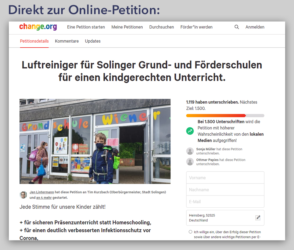 Pettitionsseite: https://www.change.org/p/luftreiniger-f%C3%BCr-solinger-grund-und-f%C3%B6rderschulen-f%C3%BCr-einen-sicheren-und-kindgerechten-pr%C3%A4senzunterricht?source_location=topic_page