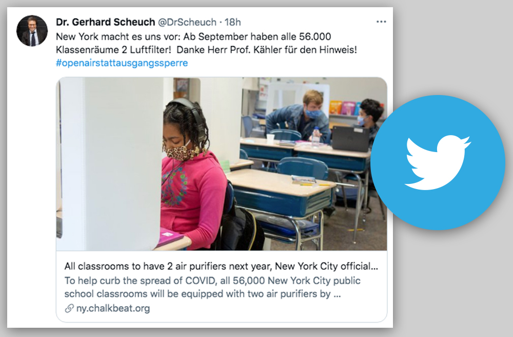 Die amerikanische Gesundheitsbehörde Centers for Disease Control an Prevention (CDC), die Weltgesundheitsorganisation (WHO) und auch die renommierte Harvard T.H. Chan School of Public Health empfehlen den Einsatz von mobilen Luftreinigern schon länger, um das indirekte Infektionsrisiko in Innenräumen zu minimieren. Daher werden im amerikanischen New York City im September alle 56.000 öffentlichen Klassenräume mit jeweils zwei mobilen HEPA-Luftreinigern ausgestattet. Ein konsequentes Vorgehen zum Schutz der Jüngsten in unserer Gesellschaft, der auch von deutschen Aerosolexperten ausdrücklich begrüßt wird.