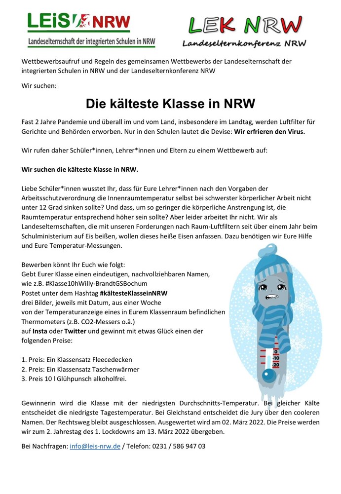 Allerdings verfügen noch längst nicht alle Schulen über ausreichend Luftreiniger in allen Klassen. Ein für die Schüler und Lehrer untragbarer Zustand, auf den die Landeselternkonferenz NRW (LEIS NRW) und die Landeselternschaft der integrierten Schulen in NRW (LEK NRW) nun mit einem provokanten Wettbewerb aufmerksam machen. Gesucht wird die kälteste Klasse in NRW. Noch bis März können Schülerinnen und Schüler unter dem Hashtag #kältesteklasseinNRW Bilder von Temperaturanzeigen aus ihren Klassenräumen auf Instagram und Twitter posten. Den Gewinnern des Wettbewerbs winken beispielsweise ein Satz Fleecedecken für die gesamte Klasse, Taschenwärmer oder zehn Liter alkoholfreier Glühweinpunsch zum Aufwärmen im Unterricht.