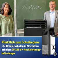 Pünktlich zum Ende der Sommerferien wurden alle Klassen- und Fachräume sowie Lehrerzimmer der beiden benachbarten Ursulinen-Schulen mit insgesamt 75 hocheffizienten TAC V+ Hochleistungsreinigern ausgestattet, die potentiell infektiöse SARS-CoV-2-Viren aus der Luft filtern.