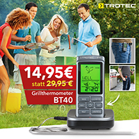 Das BT40 ist flexibel für Grill, Herd oder Backofen einsetzbar: Sobald Sie die Messspitze in das Gargut einführen, sendet die mit dem Temperaturmessfühler verbundene Basisstation regelmäßig in kurzen Abständen die aktuelle Ist-Temperatur an das mobile Empfänger-Handteil. Welches Ihnen das Erreichen des gewünschten Garzustandes via Signalton und Display-Farbwechsel anzeigt und ist dank seiner Funkreichweite von bis zu 20 m auch ideal für den mobilen Einsatz im Freien geeignet.