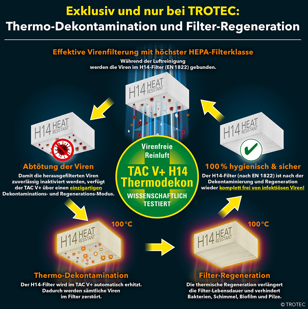 Um eine Konzentration der Viren im Filter und eine erneute Freisetzung der abgeschiedenen Krankheitserreger zu vermeiden, kommt im TAC V+ ein neuartiger H14-Heat-Resistant -HEPA®-Filter (zertifiziert nach EN 1822) zum Einsatz. Dieser von Trotec entwickelte Spezialfilter wird regelmäßig auf 100 °C erhitzt, um Viren und Keime zuverlässig abzutöten. Nur so kann kein infektiöses Virus aus dem Filter erneut in die Umgebungsluft gelangen. Durch die thermische Dekontamination des Filters wird sichergestellt, dass das Gerät nicht selbst zur „Virenschleuder“ wird.