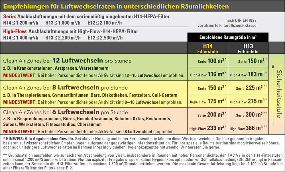 Die vom Luftreiniger TAC V+ erzeugte Luftwalzenströmung stellt selbst in großen Räumen sicher, dass die gesamte Raumluft mindestens sechsmal pro Stunde im HEPA-Filter gereinigt wird. Ein mindestens 6-facher Luftwechsel sei bei normaler Personenbelegung in Räumen erforderlich, so die wissenschaftliche Bewertung der notwendigen Luftwechsel durch die Universität der Bundeswehr München. Bei Bedarf bietet der Raumluftreiniger TAC V+ mit einer max. Reinluftleistung von 2.100 m³, davon bis zu 1.200 m³ mit H14- Filterleistung und bis zu 1.800 m³ bei H13-Filtrierung, ausreichend Leistungsreserven auch für höhere Luftwechselraten.