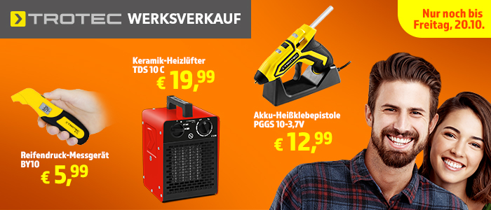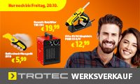 Heute, morgen und am Freitag besteht noch die Möglichkeit von den günstigen Preisen im Trotec Werksverkauf zu profitieren. Infrarot-Heizstrahler, Elektroheizgeräte, Gas- und Ölheizer, Luftentfeuchter, Elektrowerkzeuge, Messgeräte und vieles mehr…