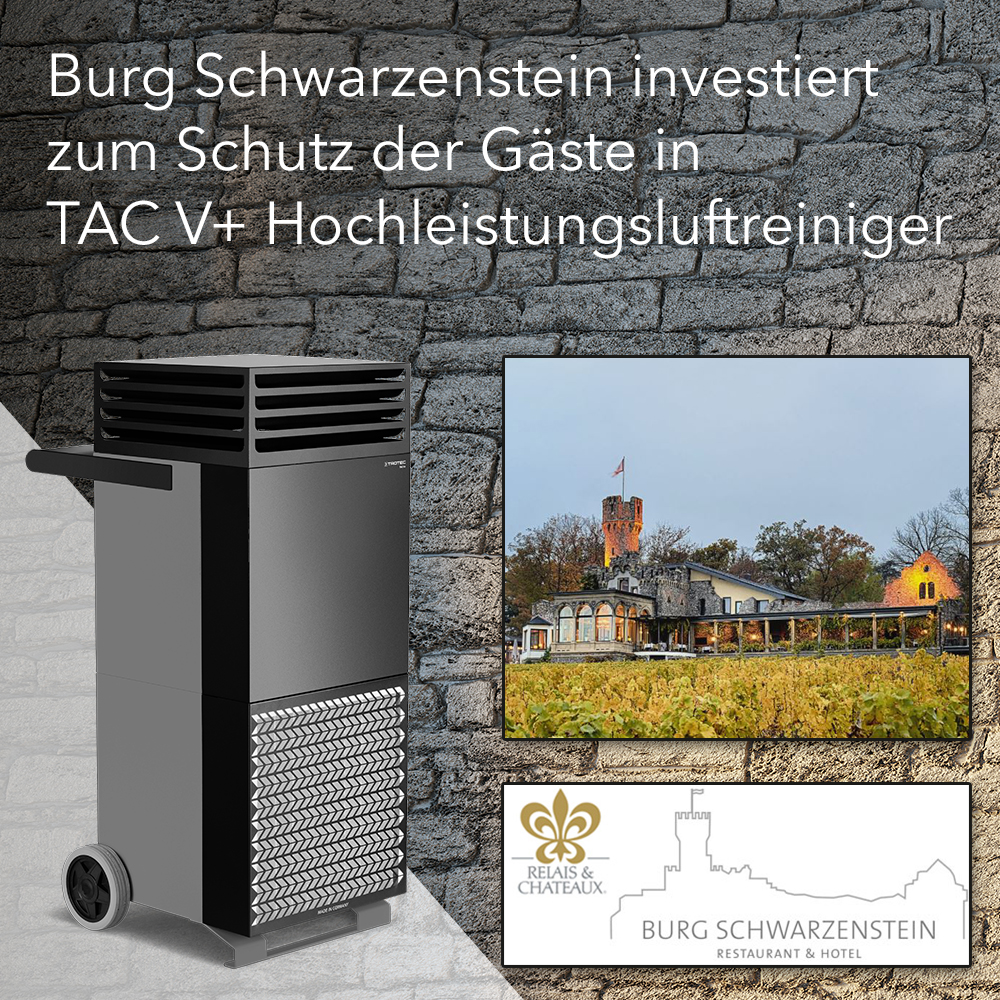 Geht es um Qualität, Leistung und Service in der Spitzengastronomie, macht Sternenkoch Nelson Keller, Leiter der Brasserie „Müllers auf der Burg“ im Relais & Châteaux Hotel Burg Schwarzenstein so schnell niemand etwas vor. Als Nachfolger des 2-Sterne-Kochs Nils Henkel führt Nelson seit Juni den Restaurantbetrieb hinter den denkmalgeschützten Mauern der Burg Schwarzenstein in Geisenheim durch die Wogen der Corona-Krise. Denn obgleich das im Weinbaugebiet Rheingau gelegene Hotel zu den besten Tagungshotels in Deutschland zählt, war die Corona-Krise auch hier deutlich zu spüren. Noch während der Corona-bedingten Schließung feilte Michael Teigelkamp, Gastgeber auf der Burg Schwarzenstein, daher an einem neuen Gastronomie- und Hygienekonzept, um die Corona-Ansteckungsgefahr in den Räumen auf ein Minimum zu reduzieren. Die vorhandene Klimaanlage wurde mit neuen Filtern bestückt, zusätzlich wurde in mobile TAC V+ Hochleistungsluftreiniger investiert, da selbst mit Filtern ausgerüstete Klimaanlagen nicht vor virenbehafteten Aerosolen in der Raumluft schützen.