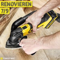 Für den Abtrag auf etwas kleineren Flächen lässt sich alternativ zum Bandschleifer auch sehr gut ein Schwingschleifer verwenden, etwa der Multifunktionsschleifer PMSS 10-220 von Trotec. Statt eines rotierenden Schleifbandes verfügt der Schwingschleifer über eine mit sehr hoher Frequenz schwingende Schleifplatte – beim klassischen Schwingschleifer ist diese rechteckig, sodass sauber bis zum Rand des Untergrundes gearbeitet werden kann.