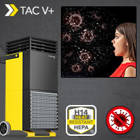 Die Gefahr, sich bei Einhaltung aller Sicherheits- und Hygienemaßnahmen über die Raumluft mit dem Coronavirus zu infizieren, sinkt durch den Einsatz eines Luftreinigers TAC V+ mit Virenfilter signifikant! Nahezu überall lassen sich durch den Einsatz des TAC V+ infektiöse Aerosolwolken in Sekundenschnelle aus der Raumluft filtern. Wo der mobile Luftreiniger TAC V+ platziert wird, schafft er saubere und virengefilterte „Reinluftbereiche“. In diesen Bereichen bleibt die Umgebungsluft weitgehend frei von luftgetragenen Keimen und Viren.