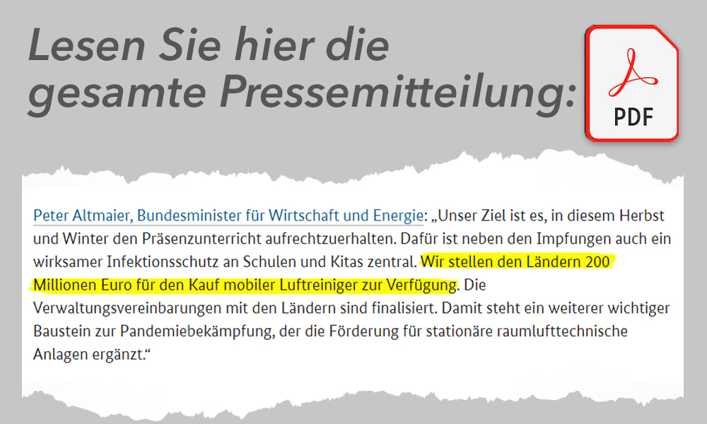 Dafür sei neben den Impfungen auch ein wirksamer Infektionsschutz an Schulen und Kitas zentral. „Wir stellen den Ländern 200 Millionen Euro für den Kauf mobiler Luftreiniger zur Verfügung. Die Verwaltungsvereinbarungen mit den Ländern sind finalisiert. Damit steht ein weiterer wichtiger Baustein zur Pandemiebekämpfung, der die Förderung für stationäre raumlufttechnische Anlagen ergänzt.“, sagt Peter Altmaier. Britta Ernst, Ministerin für Bildung, Jugend und Sport des Landes Brandenburg und derzeitige Präsidentin der Kultusministerkonferenz, pflichtete Altmaier bei. Es sei gut, dass die finanzielle Unterstützung des Bundes jetzt komme.