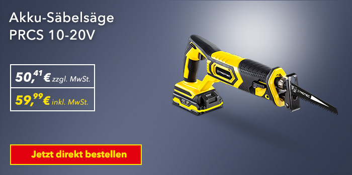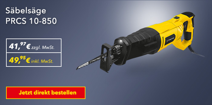 Die Akku-Säbelsäge PRCS 10-20V ist für wenige Tage zum Deal-Sonderpreis von nur 59,99 € (statt 109,94 € UVP) im Trotec-Online-Shop bestellbar. Um satte 44 % reduziert erhältlich ist die kabelgebundene Säbelsäge PRCS 10-850. Heute bestellt und schon morgen unterwegs zu Ihnen!
