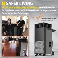 Die mobilen Hochleistungsluftreiniger der TAC V-Serie ermöglichen einen hohen Schutz vor unsichtbaren Viruspartikeln in der Raumluft. Die indirekte Ansteckungsgefahr – durch die Einatmung virenbehafteter Aerosolpartikel in geschlossenen Räumen – wird durch den Einsatz der Luftreiniger nahezu auf null reduziert. Eingesetzt werden die Trotec-Hochleistungsluftreiniger speziell in Räumen, in denen sich regelmäßig mehrere Menschen aufhalten, wie zum Beispiel in den Gemeinschaftsräumen, im Speisesaal, im Besprechungsraum der Pflege sowie in den Dienstzimmern der Wohnbereiche. Auch die Tagespflege und der ambulante Pflegedienst wurden mit TAC V+ Luftreinigern ausgestattet.