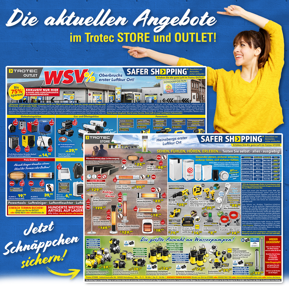 *Die Artikel liegen in begrenzter Menge vor und können daher bereits am ersten Aktionstag ausverkauft sein. Abgabe nur an Endverbraucher in haushaltsüblichen Mengen. Die Aktions-Preise gelten exklusiv nur für diesen Newsletter bis Sa., 01.05. und sind nur bei Trotec vor Ort in Heinsberg gültig.