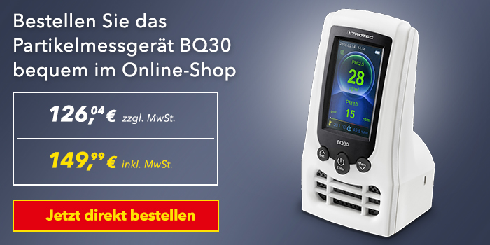Gehen Sie beim Gesundheitsschutz keine Kompromisse ein! Mit dem praktischen Partikelmessegerät BQ30 behalten Sie die Werte für Feinstaub, CO2, Lufttemperatur und Luftfeuchtigkeit zuverlässig im Blick. So können Sie gegebenenfalls durch Zufuhr von Frischluft oder durch den effektiven Einsatz von mobilen Luftreinigern, Luftbefeuchtern oder Luftentfeuchtern das Raumklima verbessern und infektiöse Viren aus der Raumluft filtern. Der in seiner Geräteklasse herausragende Messbereich von 9.999 ppm übertrifft die Fördervoraussetzungen des Landes gar um das Fünffache.