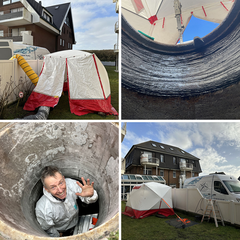 Um den frisch geschliffenen Beton im Inneren des Fettabscheiders vor Umwelteinflüssen und die Mitarbeiter vor dem kaltnassen „Schietwetter“ im Norden zu schützen, wird der geöffnete Zugang zum Abscheider mit einem wetterfesten 250 KE Montagezelt überdacht.