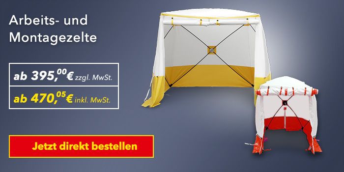 Alle Arbeitszelte von Trotec sind aus wasserundurchlässigem, lichtechtem und gegenüber den verschiedensten Wetterverhältnissen widerstandsfähigem PVC-Tuch gefertigt. Sie bieten insbesondere bei Installationsarbeiten einen effektiven Regen- sowie Kälteschutz und ermöglichen bei Schlechtwetter ein unterbrechungsfreies Arbeiten. Das isolierte Zelttuch ist doppelt vernäht, leicht zu reinigen und auch mit chemischen Desinfektionsmitteln problemlos desinfizierbar. Bei Bedarf liefert Trotec spezielle Elektroheizer wie den TEH 70, den TEH 100, den TDE 95 oder den tanklosen Ölheizer IDS 30 F für die Innenraumbeheizung direkt mit, ebenso spezielle Luftentfeuchter wie den TTR 400 D oder den TTR 500 D mit DryBox zur Innenraum-Umlufttrocknung.