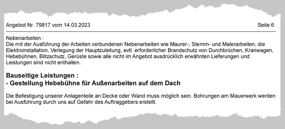 Ein erheblicher Kostenfaktor bei der Installation von Erdwärmepumpen oder Klimaanlagen mit Wärmepumpentechnik zum Heizen ist die aufwendige Installation des Außengerätes auf dem Dach oder an der Hausfassade. Für die Befestigung der Anlage und notwendige Außenarbeiten auf dem Dach braucht es fast immer ein Baugerüst oder eine Hebebühne. Diese Sicherungsvorkehrungen müssen zumeist bauseits vom Auftraggeber der Anlage gestellt werden.