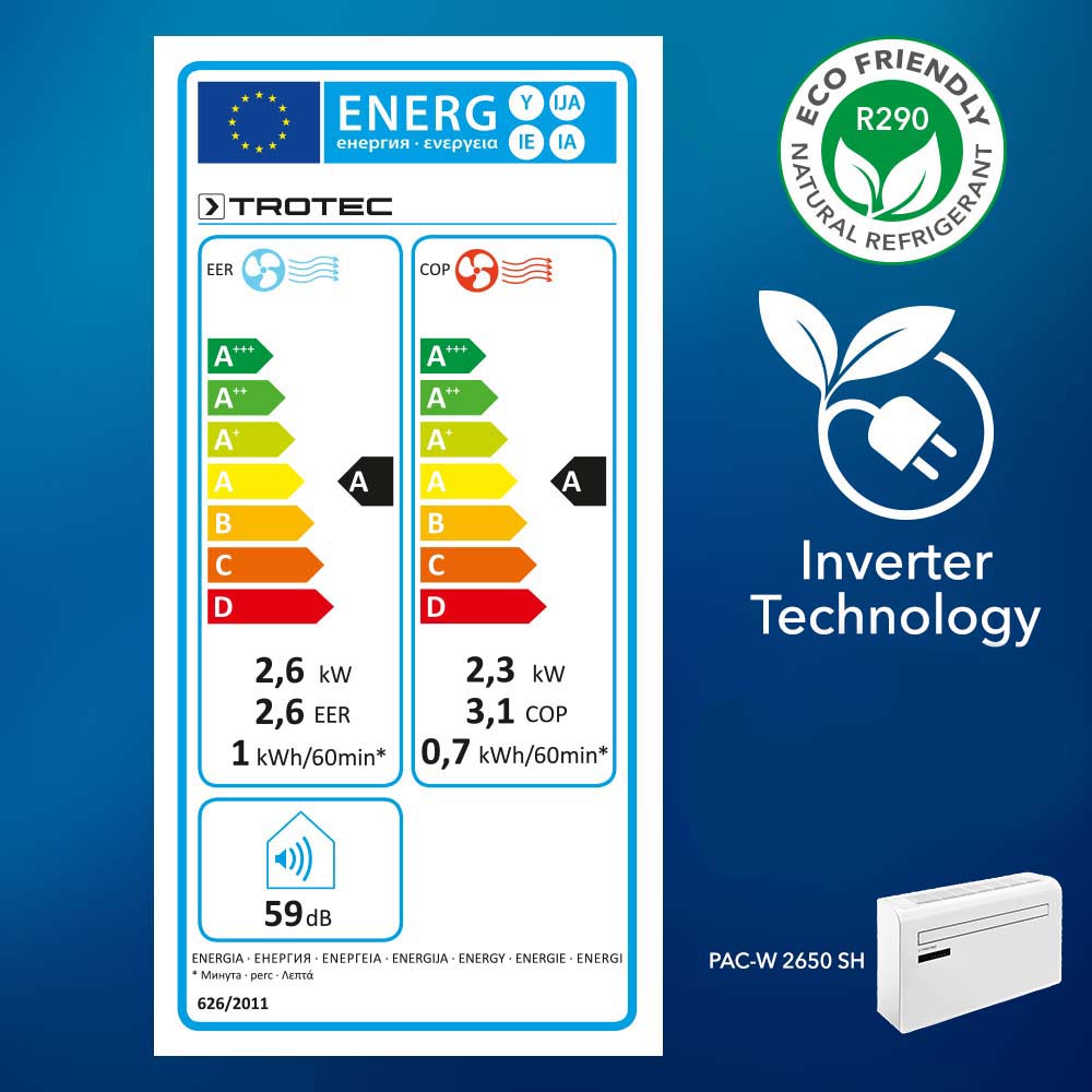 Wie effizient sich mit der Luftwärmepumpe PAC-W 2600 SH im Winter heizen und im Sommer kühlen lässt, zeigt das EU-Energieeffizienzlabel.