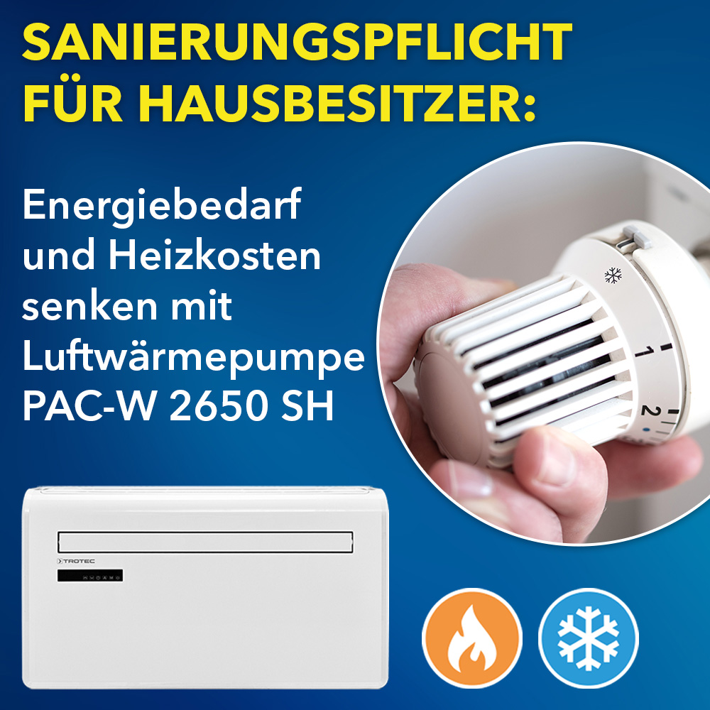 Eine kostengünstige Lösung zur energetischen Erneuerung der Heizungsanlage ist die Luftwärmepumpe PAC-W 2650 SH von Trotec, die dabei hilft, den Energieverbrauch und die Heizungskosten spürbar zu senken.