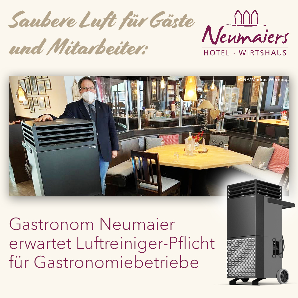 Das neue Hygienekonzept im Hotel-Restaurant Neumaier orientiert sich an den Empfehlungen des Aerosolexperten Prof. Dr. Christian Kähler. Der Münchner Universitätsprofessor erforscht seit rund 25 Jahren die Entstehung, Ausbreitung und Verdunstung von Aerosolen. Weltweite Aufmerksamkeit erlangte im vergangenen Jahr Kählers wissenschaftliche Arbeit zu Luftreinigern, in der er nachwies, dass geeignete Geräte das Coronavirus zu 99,995 % aus der Raumluft filtern können. Als Referenzgerät kam bei diesen mit Lasermesstechnik durchgeführten Untersuchungen ein TAC V+ Hochleistungsluftreiniger von Trotec zum Einsatz.