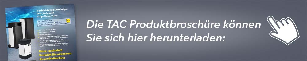 Mit den Hochleistungsluftreinigern der TAC-Serie bietet Trotec professionelle Lösungen für Reinluftqualität in Innenräumen. Durch die Bereitstellung hygienisch einwandfreier Luft gewährleisten TAC Luftreiniger einen hohen Gesundheitsschutz. Alles Wissenswerte, technische Daten und wissenschaftliche Studien zur hohen Wirksamkeit unserer TAC Hochleistungsluftreiniger enthält der 20-seitige Ratgeber „Reine, gesündere Raumluft für wirksamen Gesundheitsschutz“.