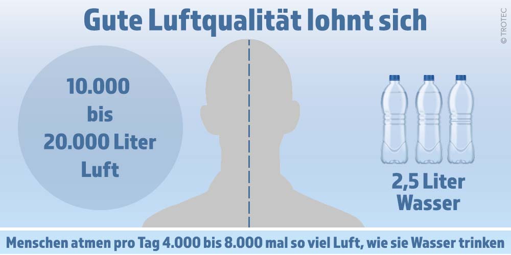 Zum Vergleich: Als Merkregel für die Flüssigkeitsaufnahme gilt bei Erwachsenen ca. 2,5 Liter pro Tag. Der menschliche Körper benötigt also zwischen 4000 bis 8000 Mal mehr Luft als Wasser, damit es ihm gut geht. Dennoch wird die Luftqualität im Alltag eher stiefmütterlich betrachtet. Während man bei der Zunahme von Flüssigkeiten auf den Nährstoffgehalt von Mineralien und Spurenelementen achtet oder stark zuckerhaltige Getränke meidet, weil diese gesundheitsschädlich sein können, wird die Qualität der eingeatmeten Luft nur in den seltensten Fällen hinterfragt.
