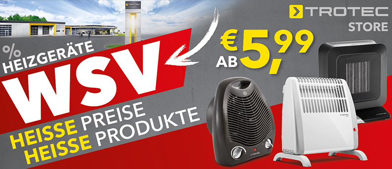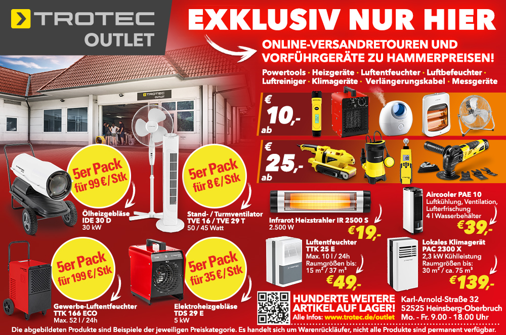 *Die Artikel liegen in begrenzter Menge vor und können daher bereits am ersten Aktionstag ausverkauft sein. Abgabe nur an Endverbraucher in haushaltsüblichen Mengen. Die Aktions-Preise gelten bis Sa. 23.03.2019 und sind nur bei Trotec vor Ort in Heinsberg gültig. Alle Preise inkl. MwSt. Für Schreibfehler keine Haftung.