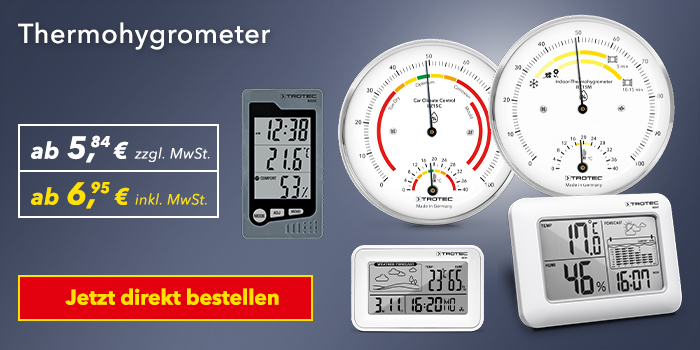 Komfortabel überwachen lässt sich die Raumluftfeuchte mit analogen oder digitalen Thermohygrometern, die neben der relativen Feuchte auch die Raumtemperatur anzeigen. Besonders praktisch sind Komfort-Wandgeräte wie das Digitale BZ05 Thermohygrometer oder das analoge BZ15C Thermohygrometer mit Wohlfühlindikator-Anzeige. So wird auf einen Blick erkennbar, ob sich das Raumklima im gesunden Bereich bewegt, oder ob eine Senkung der Luftfeuchte, etwa durch Lüften oder Luftentfeuchter, erforderlich ist.
