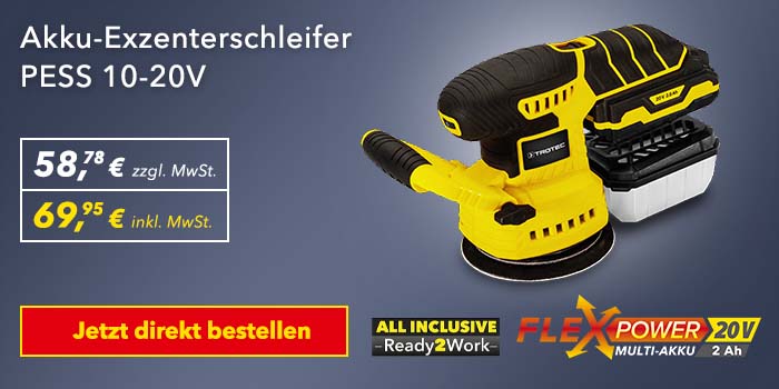 Im aktuellen myHomebook-Kaufratgeber „Schleifmaschinen im Vergleich – die besten Geräte für Heimwerker und Profis“ belegt die akkubetriebene Exzenterschleifmaschine PESS 10-20V von Trotec einen Spitzenplatz und wird von den erfahrenen Werkzeugtesten zum Vergleichssieger gekürt. Mit im Testumfeld: Multischleifer, Schwingschleifer, Winkelschleifer, Bandschleifer und Exzenterschleifer der Hersteller Einhell, Makita, Black+Decker und Bosch.