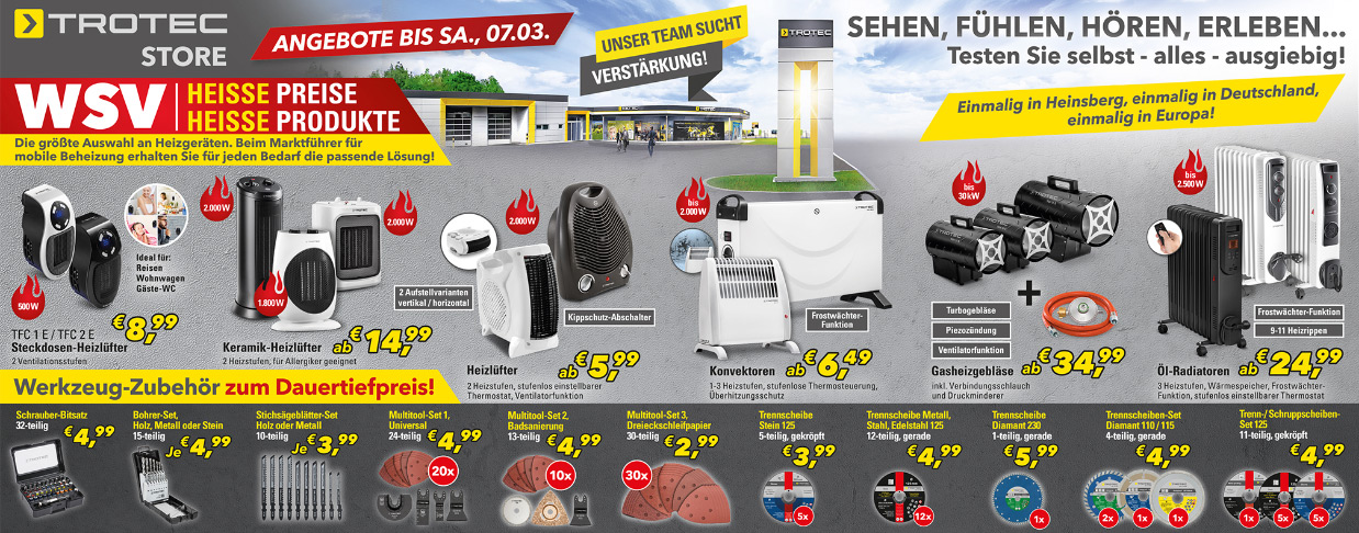 *Die Artikel liegen in begrenzter Menge vor und können daher bereits am ersten Aktionstag ausverkauft sein. Abgabe nur an Endverbraucher in haushaltsüblichen Mengen. Die Aktions-Preise im STORE gelten exklusiv nur für diesen Newsletter bis Sa., 07.03.2020 und sind nur bei Trotec vor Ort in Heinsberg gültig und für Selbstabholer.