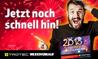 Die ganze Woche über gab es schon tolle Angebote aus unserer Zeitungsbeilage in der SuperSonntag. Wer bis Freitag, 5.1. schnell noch ein paar Schnäppchen ergattern will, sollte von 8 bis 17 Uhr beim Trotec Werksverkauf hereinschauen.