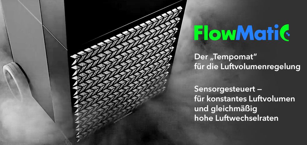 In den Trotec-Hochleistungsluftreinigern TAC XT, TAC V+ und TAC M, die explizit zur Ausfilterung virenbehafteter Aerosole in Innenräumen entwickelt wurden, arbeitet eine spezielle Steuerung, um die Alterungsproblematik vollautomatisch zu lösen – die innovative FlowMatic-Steuerung. Wie beim „Tempomat“ im Pkw erfasst die FlowMatic-Sensorik die Ist-Werte des Luftdurchsatzes innerhalb der gesamten Filterkette und passt die Systemleistung dynamisch an. So bleibt der einmal voreingestellte Zielwert für das Luftvolumen in jeder Situation konstant! Dies erhöht nicht nur die Filterstandzeit und Systemeffizienz, sondern garantiert auch die Einhaltung der im jeweiligen Hygienekonzept vorgeschriebenen Umwälzrate. Luftreiniger ohne FlowMatic-Steuerung können die Anforderungen an die Einhaltung der geforderten Luftumwälzungen nicht dauerhaft und sicher erfüllen.