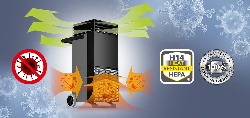 Die Hochleistungsluftreiniger TAC V+ und TAC XT verfügen über eine frei programmierbare Filter-Dekontamination. Dabei wird der speziell für Trotec entwickelte H14-Metalllamellen-Hochtemperaturfilter erhitzt (15 Minuten bei ungefähr 100 °C), um die Filterlebensdauer und damit die Austauschintervalle zu verlängern.