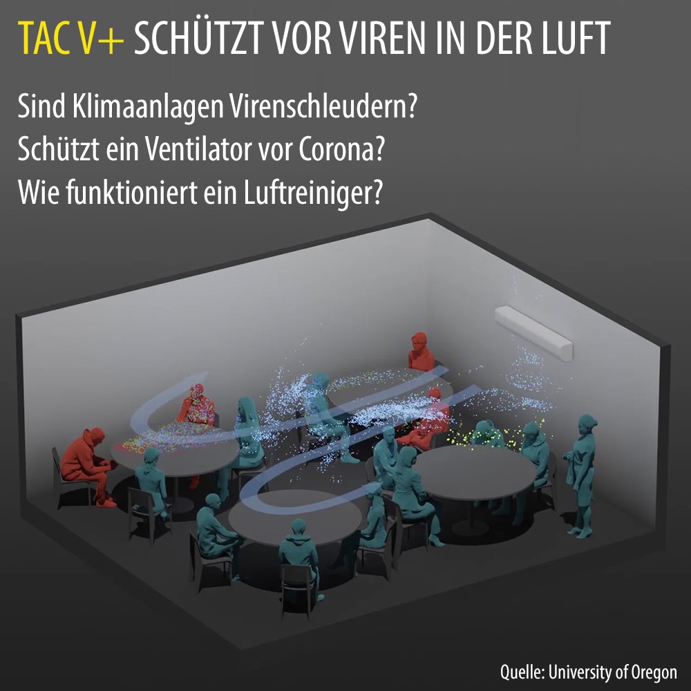 Einen wirksamen Schutz vor Viren in der Raumluft bietet nur ein Hochfrequenz-Luftreiniger wie der TAC V+ mit HEPA-Filterung und hoher Luftleistung