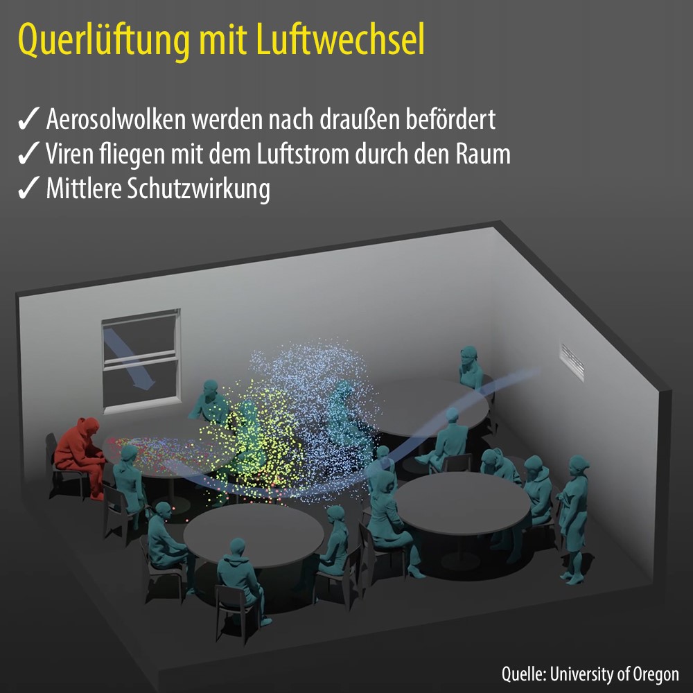 Mit der Querlüftung geht auch immer ein Luftwechsel einher. Die keimbelastete Raumluft zieht nach draußen und frische Luft strömt in den Raum ein. Allerdings birgt diese Lüftungsart auch Risiken. Insbesondere in Büros oder Restaurants mit vielen Personen fliegen infektiöse Aerosole zuerst durch den ganzen Raum, bevor sie aus dem Fenster nach außen entweichen. Im Luftstrom befindliche Personen atmen diese Aerosole daher zwangsläufig ein.
