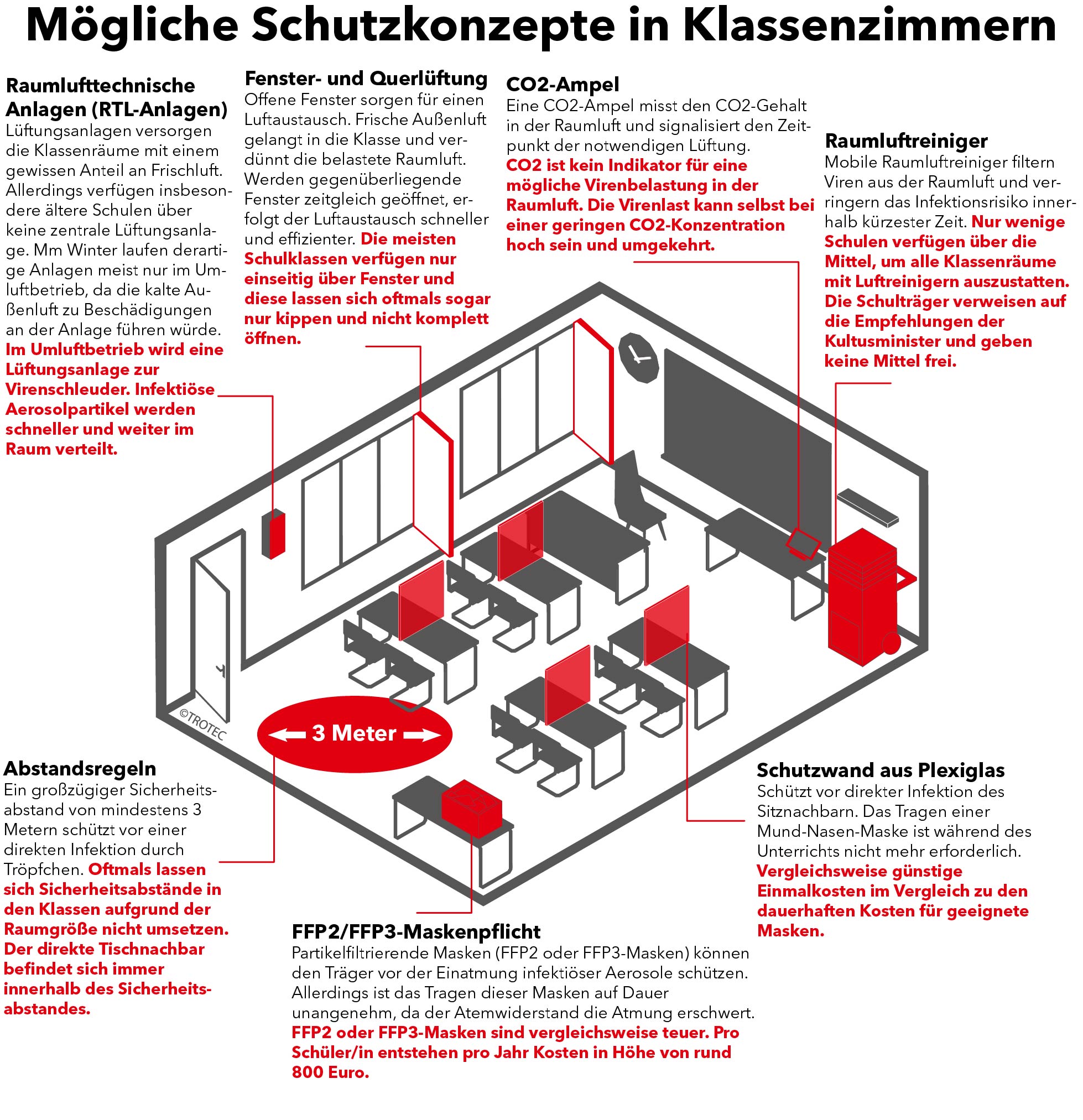 Um das Risiko einer Ansteckung mit dem Coronavirus SARS-SoV-2 durch Aerosole in den Klassenräumen zu verringern, empfehlen die Kultusminister und das Umweltbundesamt regelmäßiges Lüften. Die Schulen sind angehalten, alle 20 Minuten die Fenster für rund 3-5 Minuten zum Stoßlüften zu öffnen, um einen ausreichenden Luftaustausch zu gewähren. Eine Maßnahme, die nicht nur hinsichtlich der kalten Außentemperaturen im Winter für erstauntes Kopfschütteln der Experten, Häme aus dem Ausland und harsche Kritik der Eltern- und Lehrerverbände sorgt.