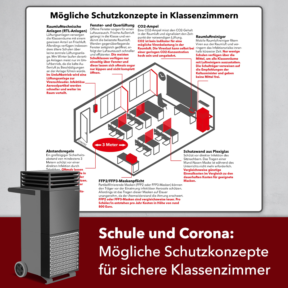 In seiner jüngsten Studie „Schulunterricht während der SARS-CoV-2 Pandemie ‒ Welches Konzept ist sicher, realisierbar und ökologisch vertretbar?“ hat Christian Kähler ein eigenes Schutzkonzept vorgestellt, wie der Präsenzunterricht an Schulen auch im Winter maximal infektionssicher gestaltet werden könne. Kähler empfiehlt mobile Luftreiniger wie den TAC V+ Hochleistungsluftreiniger in jedem Klassenzimmer und zusätzlich Trennwände aus Plexiglas zwischen den Sitzplätzen der Schülerinnen und Schüler.