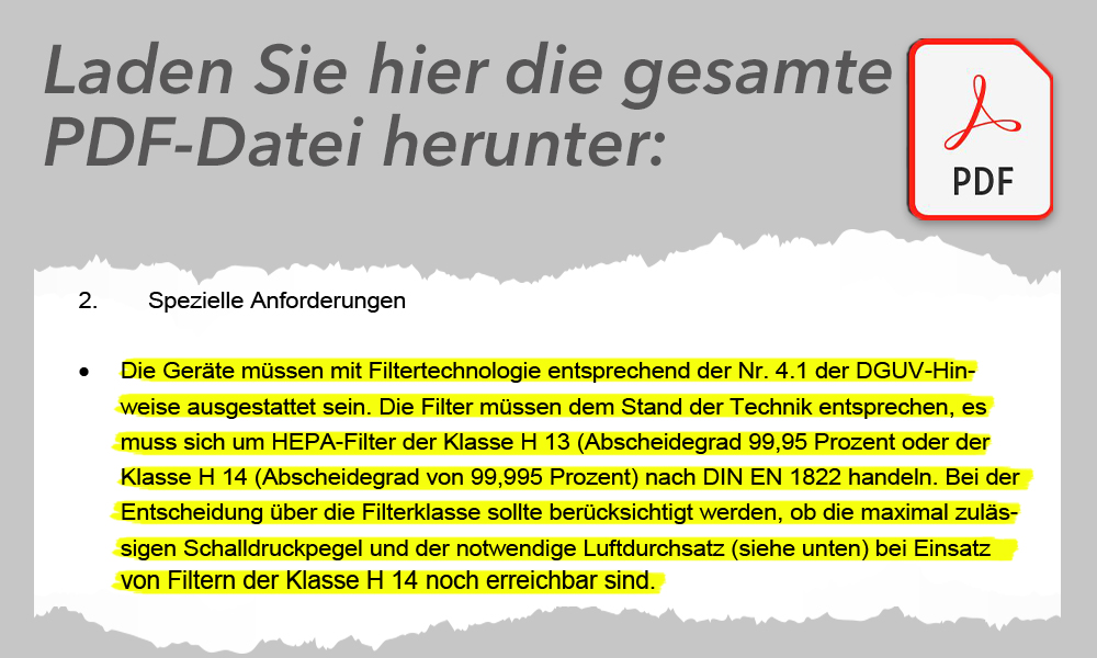 „Die Geräte müssen mit Filtertechnologie entsprechend der Nr. 4.1 der DGUV-Hinweise ausgestattet sein. Die Filter müssen dem Stand der Technik entsprechen, es muss sich um HEPA-Filter der Klasse H 13 (Abscheidegrad 99,95 Prozent oder der Klasse H 14 (Abscheidegrad von 99,995 Prozent) nach DIN EN 1822 handeln. Bei der Entscheidung über die Filterklasse sollte berücksichtigt werden, ob die maximal zulässigen Schalldruckpegel und der notwendige Luftdurchsatz (siehe unten) bei Einsatz 2 von Filtern der Klasse H 14 noch erreichbar sind.“