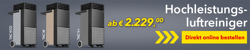 1. Der Volumenstrom des Luftreinigers muss ausreichend dimensioniert sein, um mindestens einen sechsfachen Luftwechsel pro Stunde zu ermöglichen. Nur so kann eine minutenschnelle Senkung der Aerosolkonzentration im Raum sichergestellt werden. Hochleistungsluftreiniger wie der TAC V+ der TAC Serie ermöglichen sogar einen bis zu 16-fachen Luftwechsel pro Stunde und bieten somit ein noch höheres Schutzniveau.