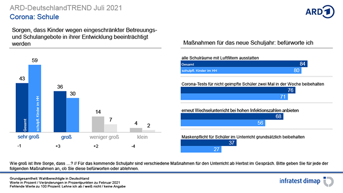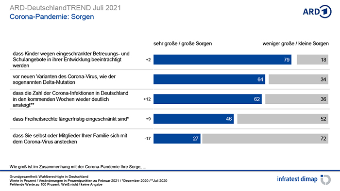 Wie groß die Sorge vor einer neuen Infektionswelle ist, zeigt der ARD-DeutschlandTREND vom 01. Juli 2021, eine repräsentative Studie im Auftrag der tagesthemen.
