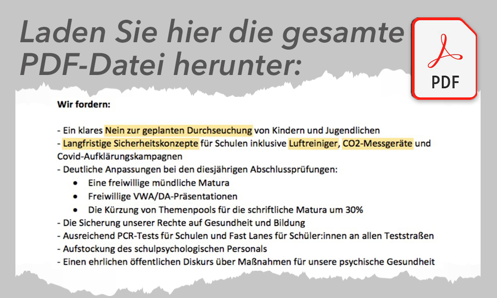 Gefordert wird in dem zweiseitigen Schreiben allen voran ein „klares Nein zur geplanten Durchseuchung von Kindern und Jugendlichen“ sowie „langfristige Sicherheitskonzepte für Schulen inklusive Luftreiniger, CO2-Messgeräte und Covid-Aufklärungskampagnen“.