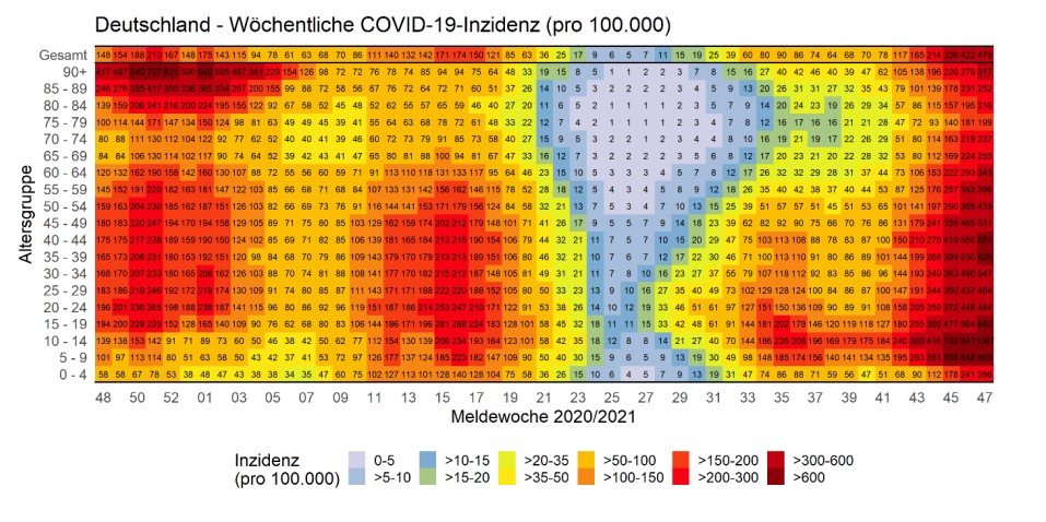 Darstellung der 7-Tage-Inzidenz der COVID-19-Fälle in Deutschland nach Altersgruppe und Meldewoche (n= 4.875.367 Fälle mit entsprechenden Angaben in den Meldewochen 48/2020 bis 47/2021; Datenstand 01.12.2021, 00:00 Uhr).