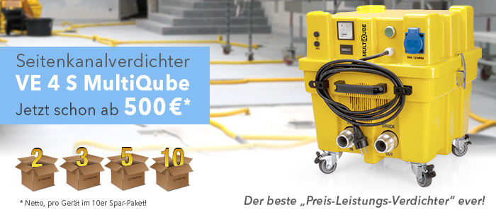 Bislang bot der Seitenkanalverdichter VE 4 S MultiQube bereits mit Abstand das beste Preis-Leistungsangebot seiner Klasse. Jetzt vergrößern wir diesen Abstand noch einmal deutlich: wir packen vier Sparpakete obendrauf! Jedes für sich ein absoluter Preishammer. Und das Beste: außer auf höhere Preise müssen Sie beim VE 4 S MiniQube weiterhin auf nichts verzichten – überzeugen Sie sich selbst!