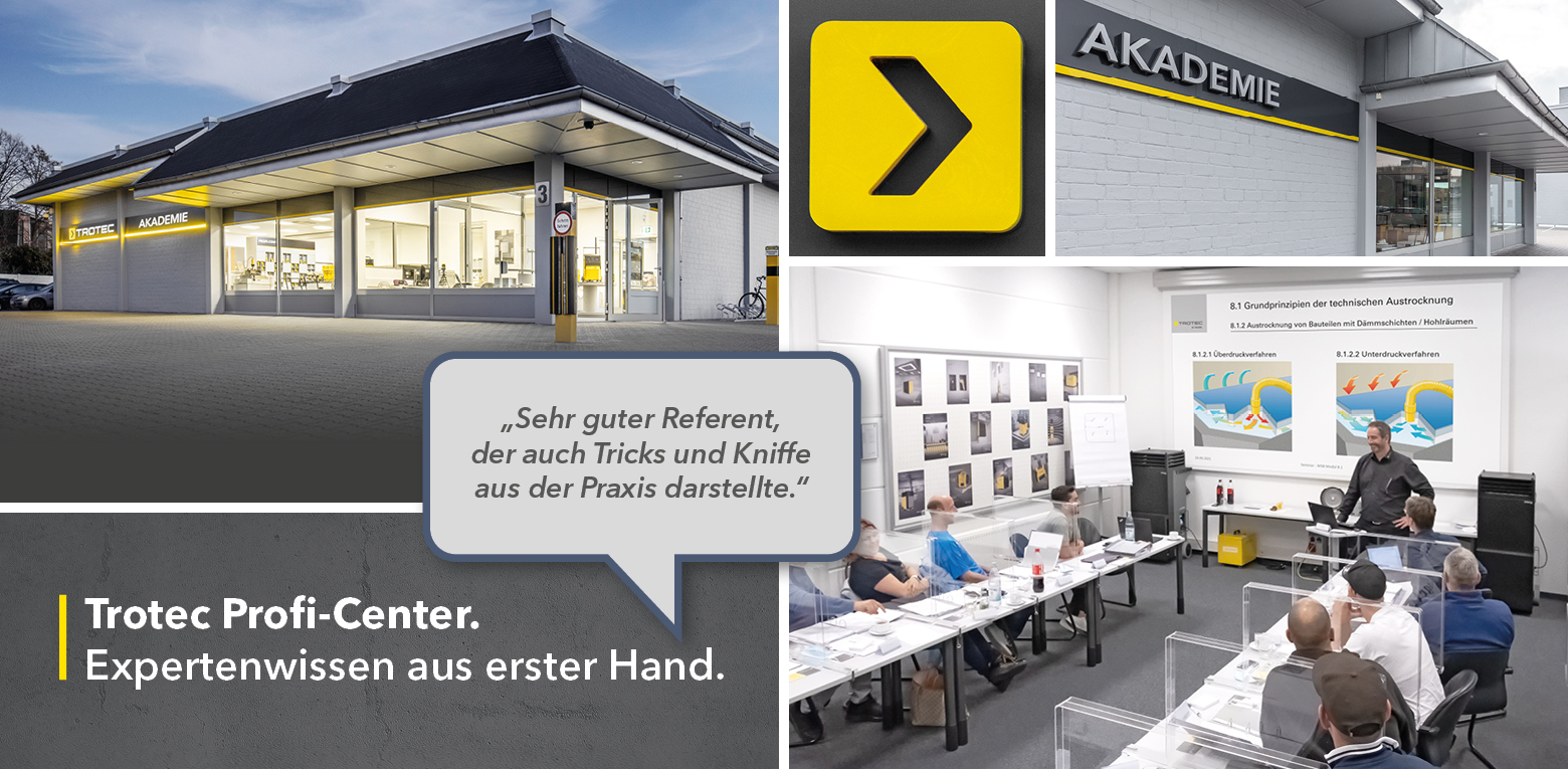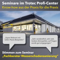 Im dreitägigen Seminar „Fachberater Wasserschadensanierung“ vermittelt unser Trotec-Referent Sanierern und Handwerksunternehmen die Grundlagen zur Austrocknung von Dämmschichten nach eingetretenem Wasserschaden (Estrich-Dämmschicht-Trocknung).